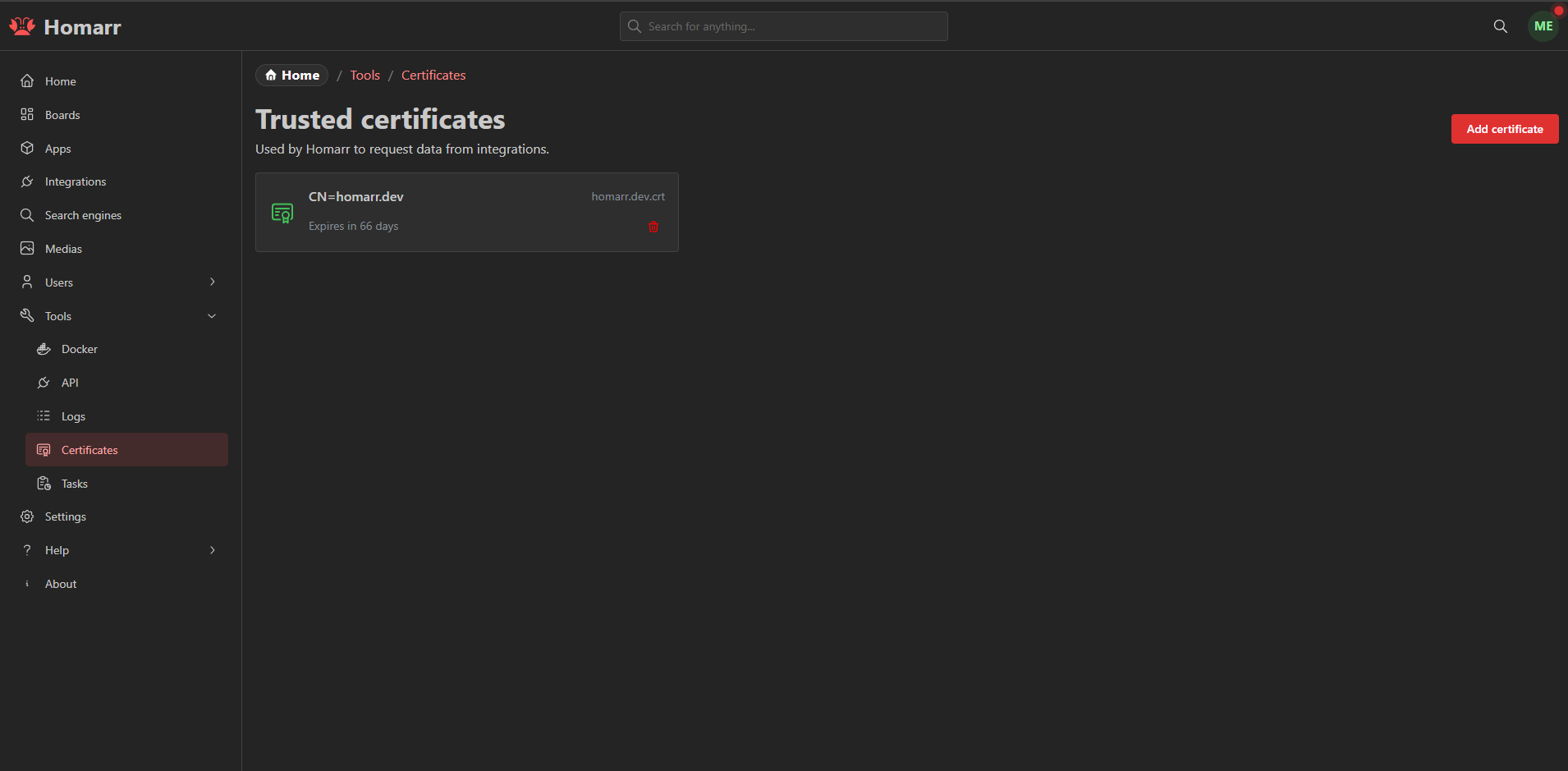 On this page you can manage your trusted certificates. For example if you use a self signed certificate for one of the integrations you want to connect, you can add it here.